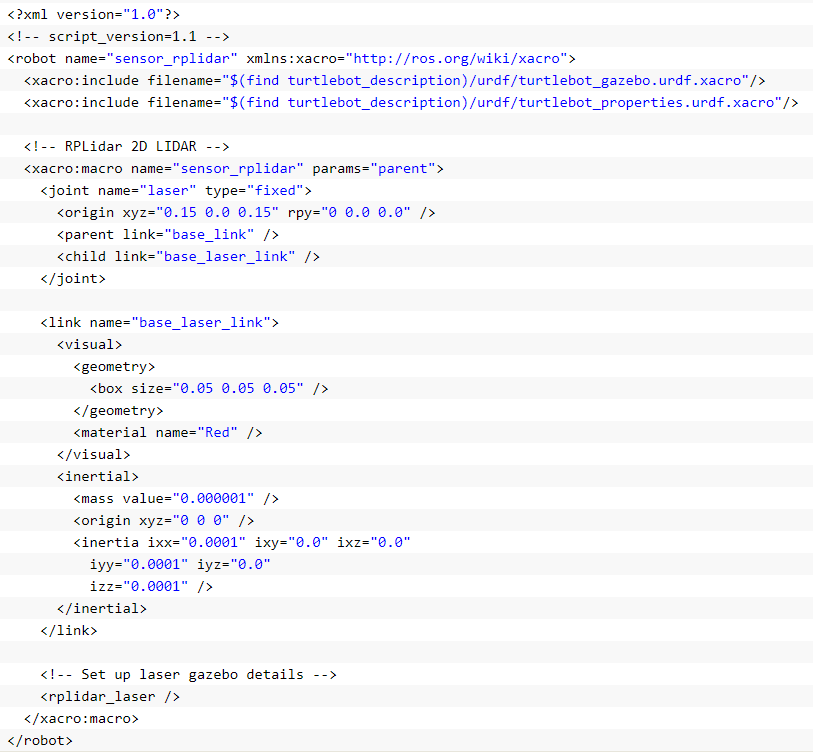 在已知的机器人模型的URDF中添加描述雷达的joint和描述在机器人本体上的link。下面是曾在turtlebot仿真模型添加rplidar模型的urdf设置。