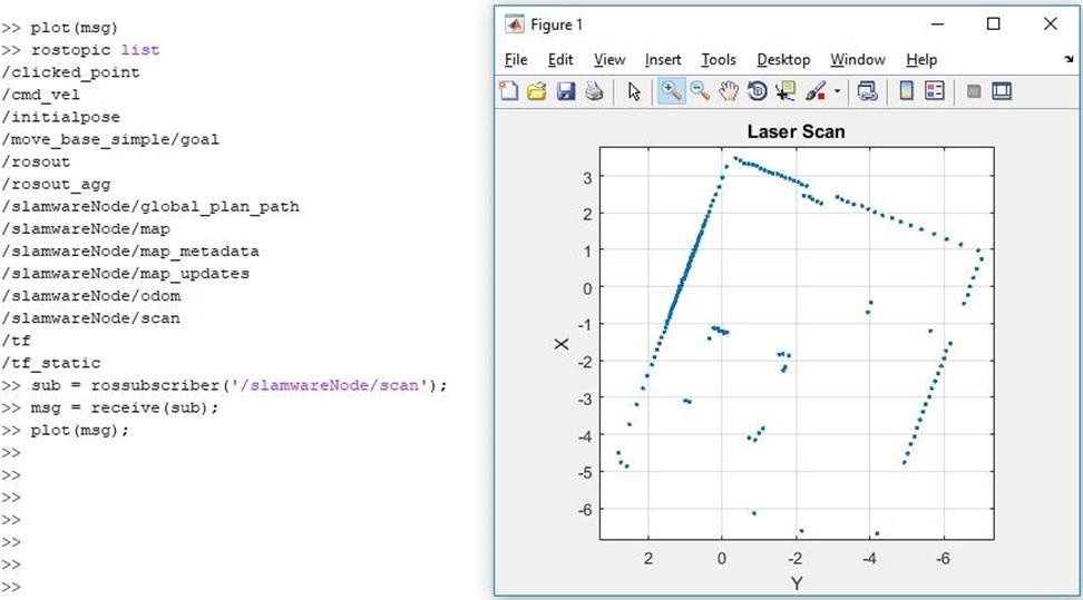 matlab2016版本当前还提供了ROS的功能接口,我们也可以通过matlab参看激光数据。