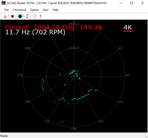A2的测距范围为0.15~8米,360°全角度测量,每秒扫描4K个点,扫描频率5~15 hz可调。