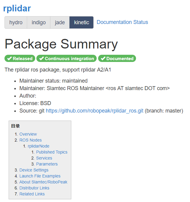 wiki主要包含对应rplidar产品功能和package接口和参数的说明和相应的使用流程介绍,以及当前ros生态支持的版本信息。