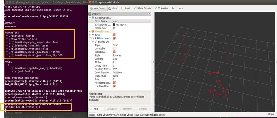 启动rplidar_ros节点,并在rviz中显示出雷达数据: