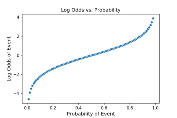 如果我们采用赔率的自然对数,那么我们得到的对数概率无限的(从负无穷大到正无穷大),并且在大多数概率上都是线性的!因为我们可以通过逻辑回归来估计对数几率,所以我们也可以估计几率,因为对数几率只是用另一种方式表示的概率。