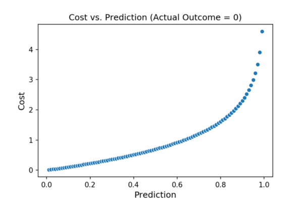 下面的图显示了成本与我们的预测之间的关系(第一个图显示了当实际结果= 1时成本相对于我们的预测如何变化,第二个图显示了当A 精算结果= 0时成本相对于我们的预测的变化)。