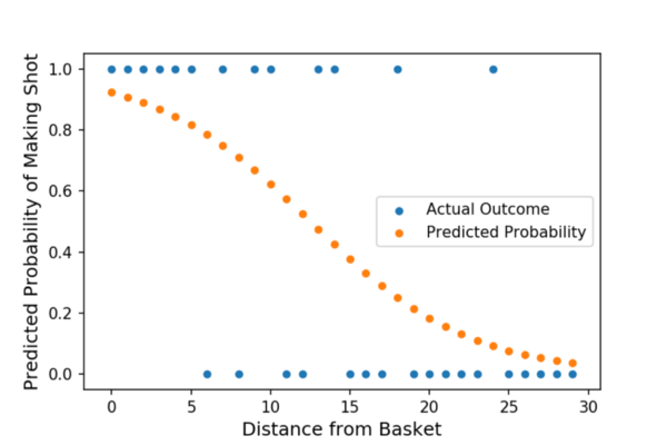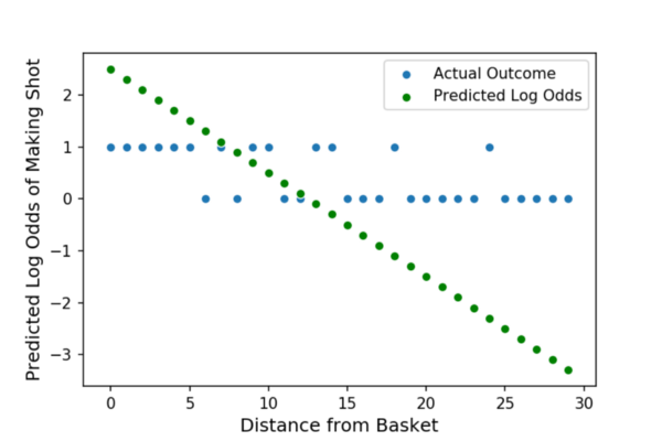 假设我想研究篮球投篮准确度和我的投篮距离之间的关系。更具体地说,我想要一个模型,以英尺为单位计算“距篮筐的距离”,并指出我进行投篮的概率。