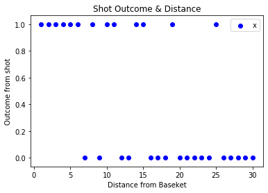 首先,我需要一些数据。因此,我在记录每个结果的同时投了不同距离的篮球(1个代表成功,0个代表失误)。在散点图上绘制时,结果如下所示: