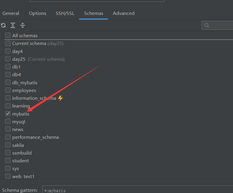 最后在Schemas这个选项下,选住我们设置的mybatis数据库