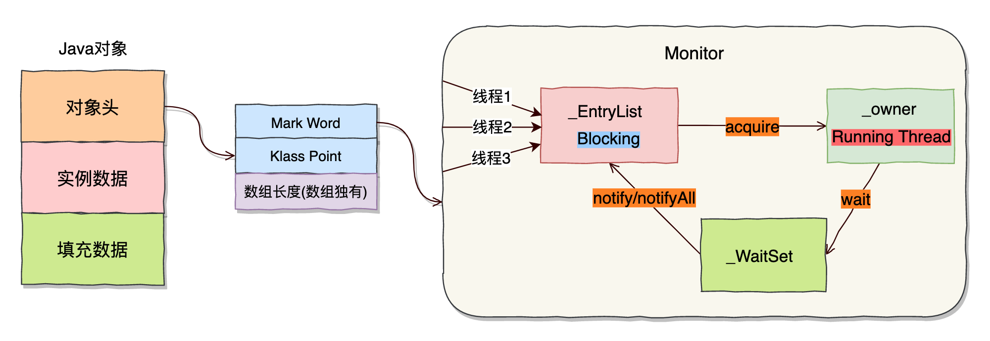 翻译:每一个对象都会和一个监视器 Monitor 关联。监视器被占用时会被锁住,其他线程无法来获取该 Monitor。
