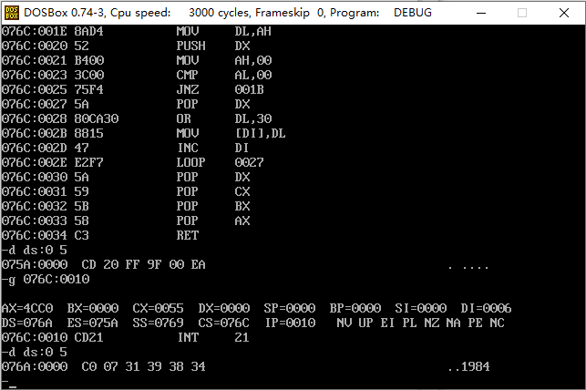 1 assume cs:code, ds:data 2 data segment 3 x dw 1984 4 str db 16 dup(0) 5 data ends 6 7 code segment 8 start: 9 mov ax, data 10 mov ds, ax 11 mov ax, x 12 mov di, offset str 13 call num2str 14 mov si, offset str 15 mov al, 2 16 mov di, 0 17 call printStr 18 19 mov ah, 4ch 20 int 21h 21 22 num2str: 23 push ax 24 push bx 25 push cx 26 push dx 27 28 mov cx, 0 29 mov bl, 10 30 s1: 31 div bl 32 inc cx 33 mov dl, ah 34 push dx 35 mov ah, 0 36 cmp al, 0 37 jne s1 38 s2: 39 pop dx 40 or dl, 30h 41 mov [di], dl 42 inc di 43 loop s2 44 45 pop dx 46 pop cx 47 pop bx 48 pop ax 49 50 ret 51 52 printStr: 53 push bx 54 push cx 55 push si 56 push di 57 58 mov bx, 0b800H 59 mov es, bx 60 s: mov cl, [si] 61 mov ch, 0 62 jcxz over 63 mov ch, al 64 mov es:[di], cx 65 inc si 66 add di, 2 67 jmp s 68 69 over: 70 pop di 71 pop si 72 pop cx 73 pop bx 74 ret 75 76 code ends 77 end start