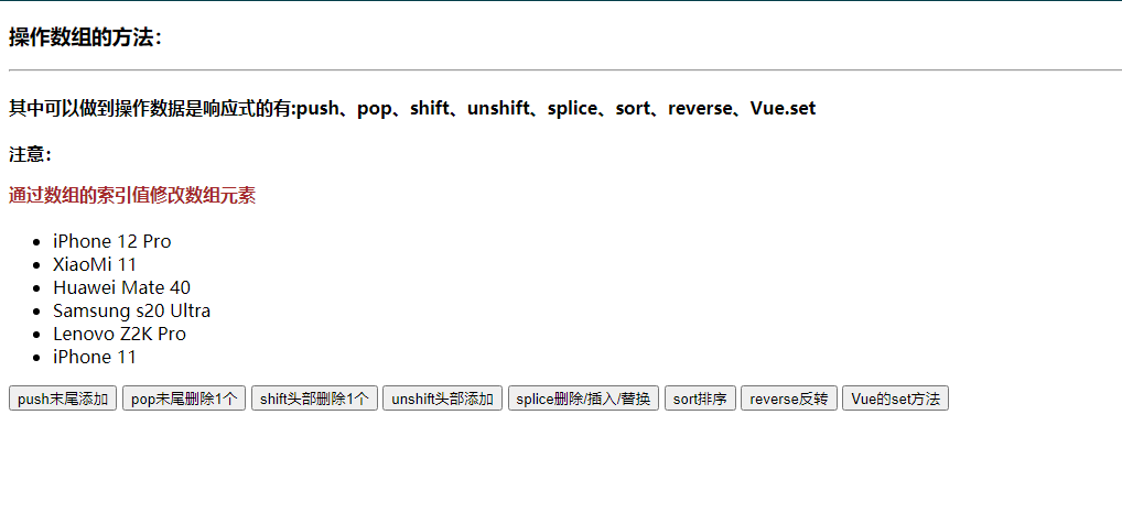 <h4>其中可以做到操作数据是响应式的有:push、pop、shift、unshift、splice、sort、reverse、Vue.set</h4>