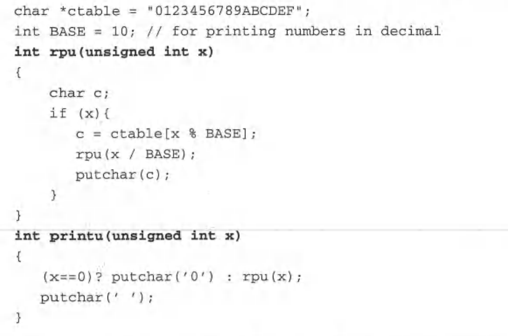 函数rpu(x)以ASCII 递归生成x% 10数字,并在返回路径上打印它们。例如,如果x=123,则按'3'、*2'、'1'的顺序生成数字,按应有的顺序打印为'1'、2'、'3'。