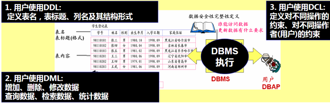 数据定义语言用来定义Table,数据操纵语言用来实现对Table的增删改查等操作,数据库控制语言用来控制用户对Table的访问权限。以上三类语言统称为数据库语言,用户利用数据库语言来操作数据库。