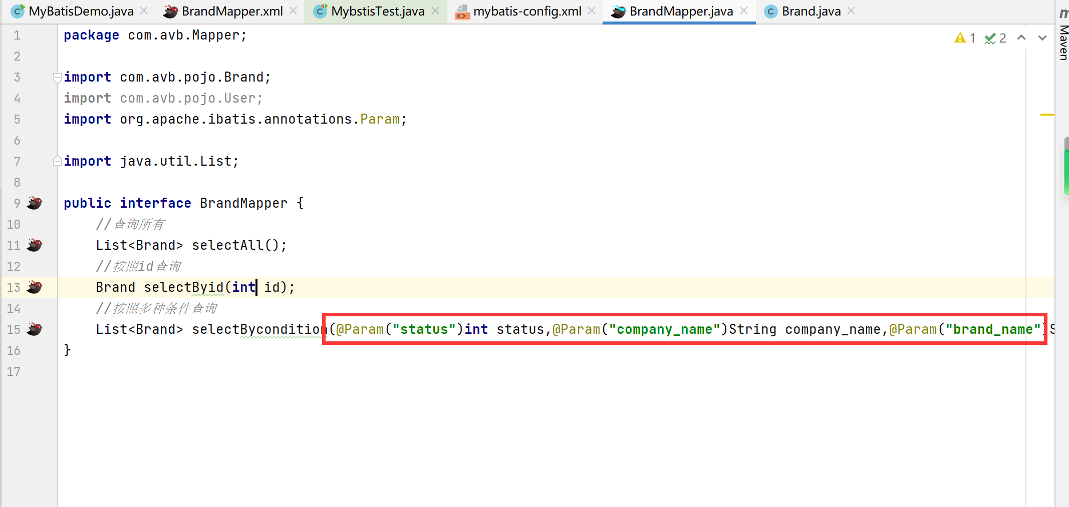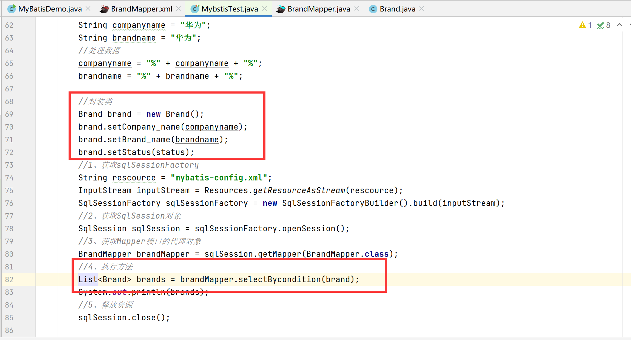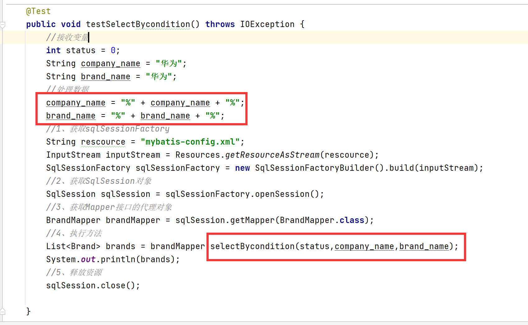 @Test public void testSelectBycondition() throws IOException { //接收变量 int status = 0; String company_name = "华为"; String brand_name = "华为"; //处理数据 company_name = "%" + company_name + "%"; brand_name = "%" + brand_name + "%"; //1、获取sqlSessionFactory String rescource = "mybatis-config.xml"; InputStream inputStream = Resources.getResourceAsStream(rescource); SqlSessionFactory sqlSessionFactory = new SqlSessionFactoryBuilder().build(inputStream); //2、获取SqlSession对象 SqlSession sqlSession = sqlSessionFactory.openSession(); //3、获取Mapper接口的代理对象 BrandMapper brandMapper = sqlSession.getMapper(BrandMapper.class); //4、执行方法 List<Brand> brands = brandMapper.selectBycondition(status,company_name,brand_name); System.out.println(brands); //5、释放资源 sqlSession.close(); } }