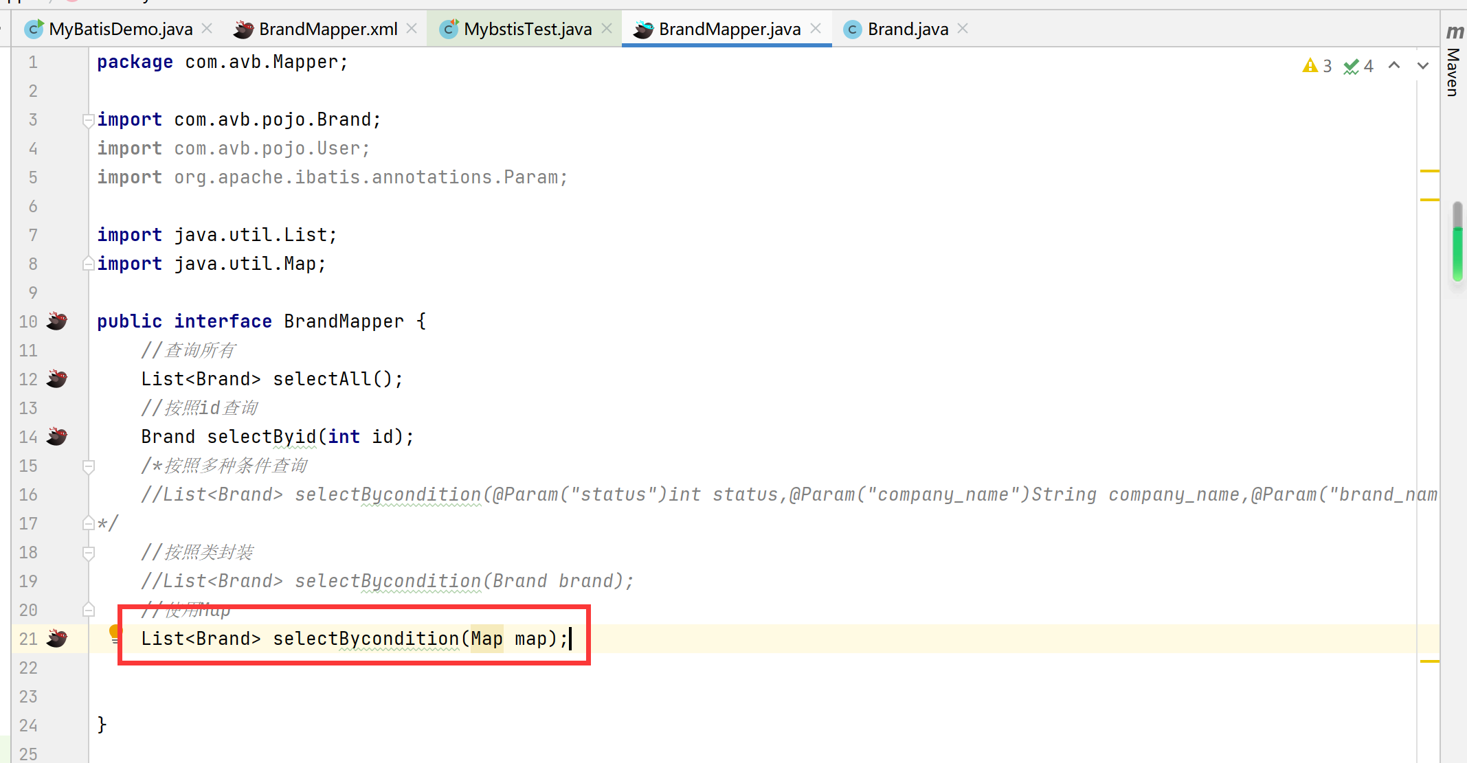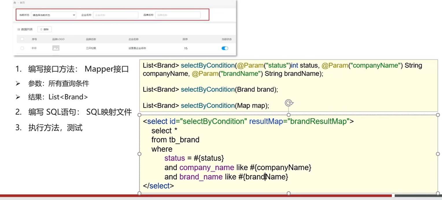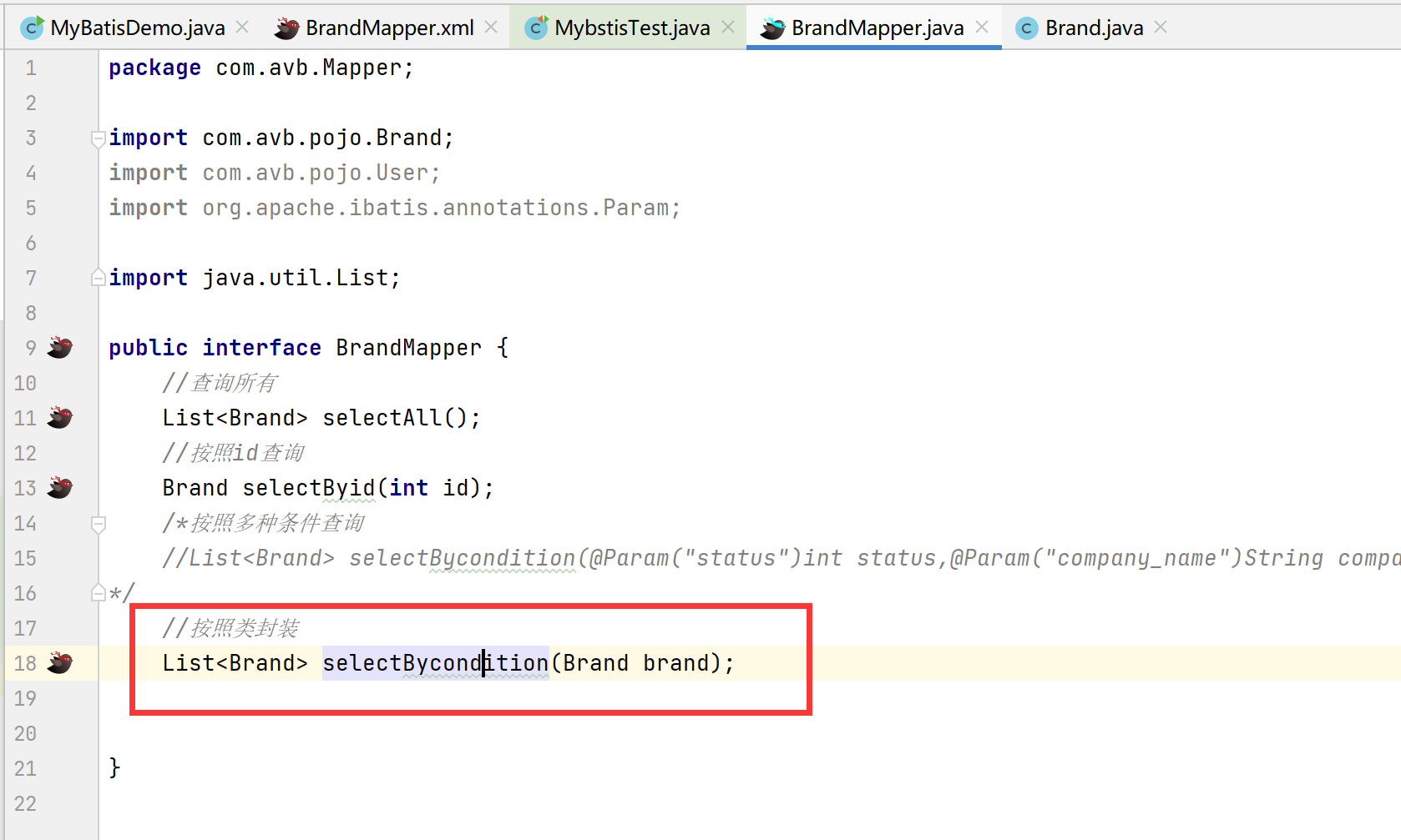 @Test public void testSelectBycondition() throws IOException { //接收变量 int status = 0; String company_name = "华为"; String brand_name = "华为"; //处理数据 company_name = "%" + company_name + "%"; brand_name = "%" + brand_name + "%"; //1、获取sqlSessionFactory String rescource = "mybatis-config.xml"; InputStream inputStream = Resources.getResourceAsStream(rescource); SqlSessionFactory sqlSessionFactory = new SqlSessionFactoryBuilder().build(inputStream); //2、获取SqlSession对象 SqlSession sqlSession = sqlSessionFactory.openSession(); //3、获取Mapper接口的代理对象 BrandMapper brandMapper = sqlSession.getMapper(BrandMapper.class); //4、执行方法 List<Brand> brands = brandMapper.selectBycondition(status,company_name,brand_name); System.out.println(brands); //5、释放资源 sqlSession.close(); } }