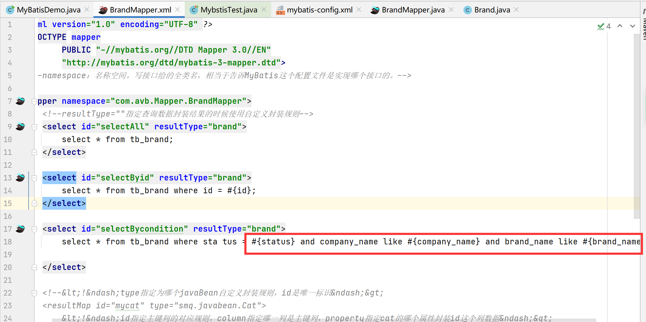 <?xml version="1.0" encoding="UTF-8" ?> <!DOCTYPE mapper PUBLIC "-//mybatis.org//DTD Mapper 3.0//EN" "http://mybatis.org/dtd/mybatis-3-mapper.dtd"> <!--namespace:名称空间。写接口给的全类名,相当于告诉MyBatis这个配置文件是实现哪个接口的。--> <mapper namespace="com.avb.Mapper.BrandMapper"> <!--resultType=""指定查询数据封装结果的时候使用自定义封装规则--> <select id="selectAll" resultType="brand"> select * from tb_brand; </select> <select id="selectByid" resultType="brand"> select * from tb_brand where id = #{id}; </select> <select id="selectBycondition" resultType="brand"> select * from tb_brand where status = #{status} and company_name like #{company_name} and brand_name like #{brand_name}; </select> </mapper>