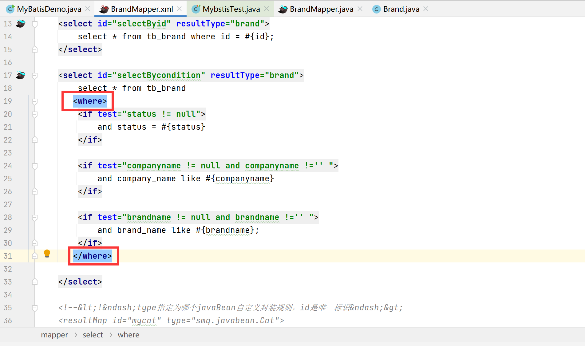 <?xml version="1.0" encoding="UTF-8" ?> <!DOCTYPE mapper PUBLIC "-//mybatis.org//DTD Mapper 3.0//EN" "http://mybatis.org/dtd/mybatis-3-mapper.dtd"> <!--namespace:名称空间。写接口给的全类名,相当于告诉MyBatis这个配置文件是实现哪个接口的。--> <mapper namespace="com.avb.Mapper.BrandMapper"> <!--resultType=""指定查询数据封装结果的时候使用自定义封装规则--> <select id="selectAll" resultType="brand"> select * from tb_brand; </select> <select id="selectByid" resultType="brand"> select * from tb_brand where id = #{id}; </select> <select id="selectBycondition" resultType="brand"> select * from tb_brand where <if test="status != null"> status = #{status} </if> <if test="companyname != null and companyname !='' "> company_name like #{companyname} </if> <if test="brandname != null and brandname !='' "> brand_name like #{brandname}; </if> </select> <select id="selectByconditionSingle" resultType="brand"> select * from tb_brand where <choose> <when test="status != null"> status = #{status} </when> <when test="company_name != null and company_name !='' "> company_name like #{company_name} </when> <when test="brandname != null and brandname !='' "> brand_name like #{brandname}; </when> <otherwise>1 = 1</otherwise> </choose> </select> <!--<!–type指定为哪个javaBean自定义封装规则,id是唯一标识–> <resultMap id="mycat" type="smq.javabean.Cat"> <!–id指定主键列的对应规则,column指定哪一列是主键列,property指定cat的哪个属性封装id这个列数据–> <id column="id" property="id"/> <!–普通列–> <result column="cName" property="name"/> <result column="cgender" property="gender"/> <result column="cAge" property="age"/> </resultMap>--> </mapper>