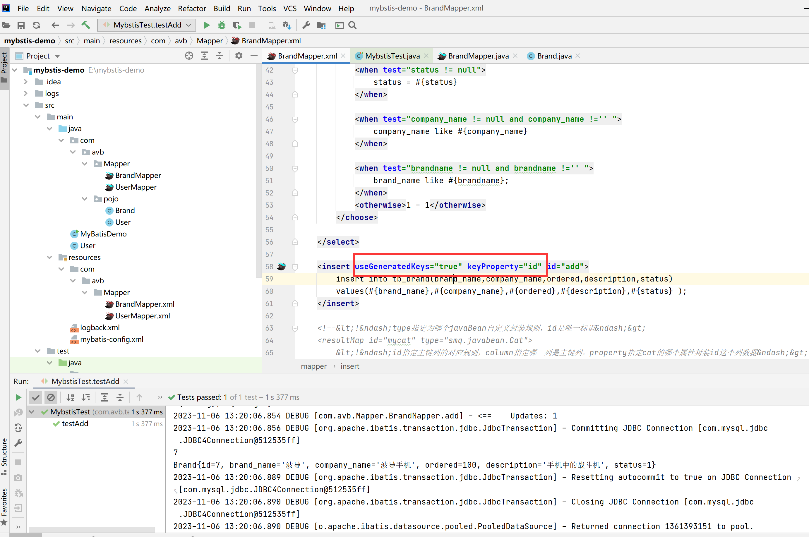 <insert useGeneratedKeys="true" keyProperty="id" id="add">