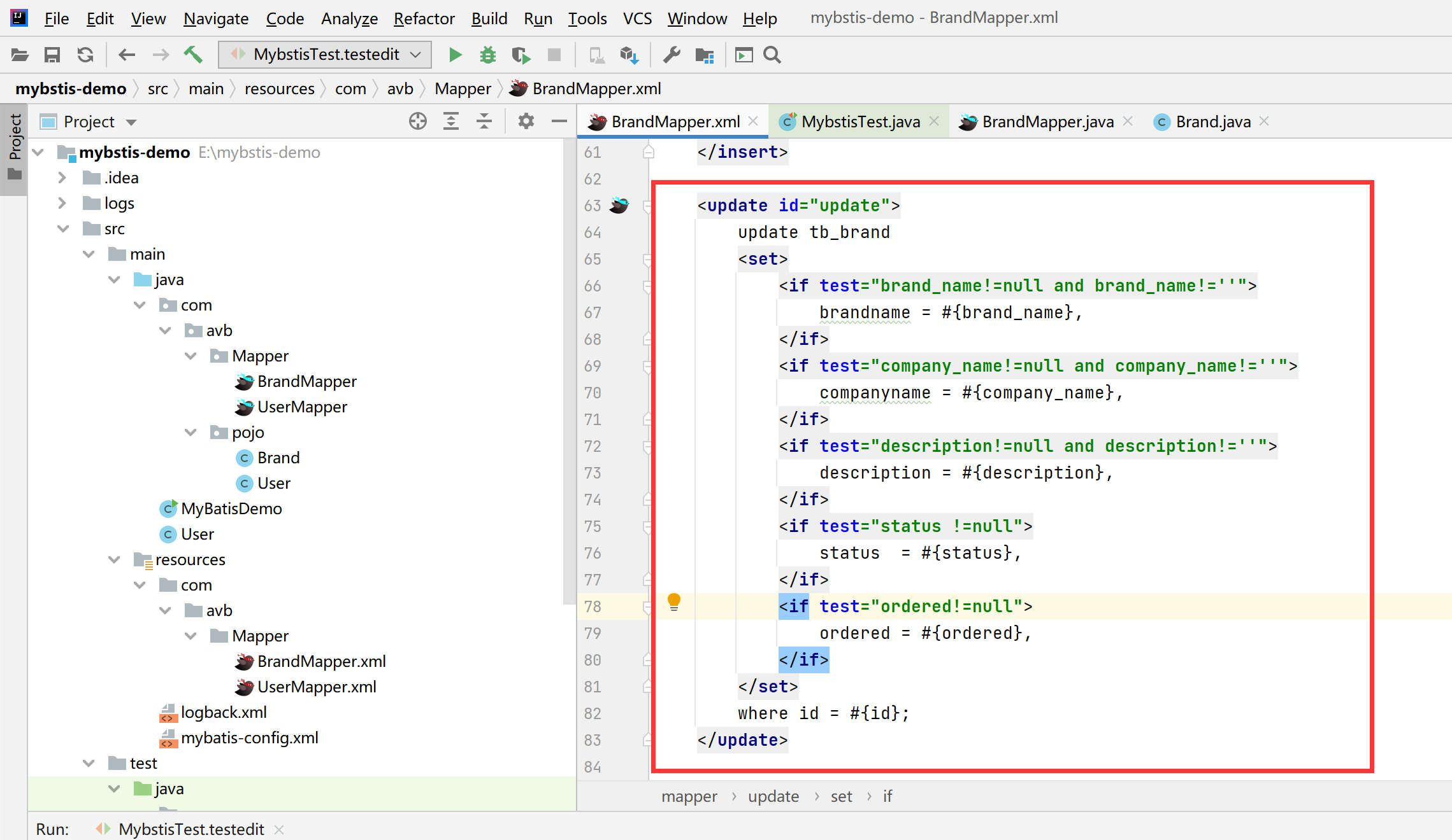 @Test public void testedit() throws IOException { //接收变量 String description = "波导手机,手机中的战斗机"; int ordered = 200; int id = 5; //String brandname = ""; //处理数据 //companyname = "%" + companyname + "%"; //brandname = "%" + brandname + "%"; //封装类 Brand brand = new Brand(); brand.setOrdered(ordered); brand.setDescription(description); brand.setId(id); /* Map map = new HashMap(); map.put("status",status); map.put("companyname",companyname); map.put("brandname",brandname);*/ //1、获取sqlSessionFactory String rescource = "mybatis-config.xml"; InputStream inputStream = Resources.getResourceAsStream(rescource); SqlSessionFactory sqlSessionFactory = new SqlSessionFactoryBuilder().build(inputStream); //2、获取SqlSession对象 SqlSession sqlSession = sqlSessionFactory.openSession(); //3、获取Mapper接口的代理对象 BrandMapper brandMapper = sqlSession.getMapper(BrandMapper.class); //4、执行方法 int count = brandMapper.update(brand); sqlSession.commit(); // //List<Brand> brands = brandMapper.selectBycondition(map); System.out.println(count); //5、释放资源 sqlSession.close(); }