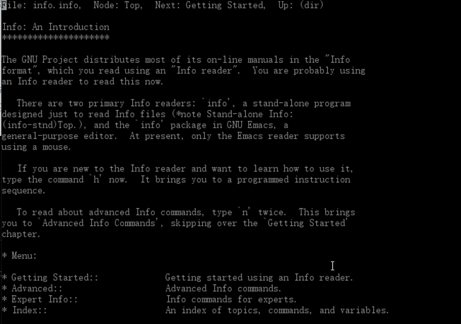 Node:代表目前的这个页面是属于Top节点。 意思是info.info内含有很多信息,而Top仅是info.info文 件内的一个节点内容而已;