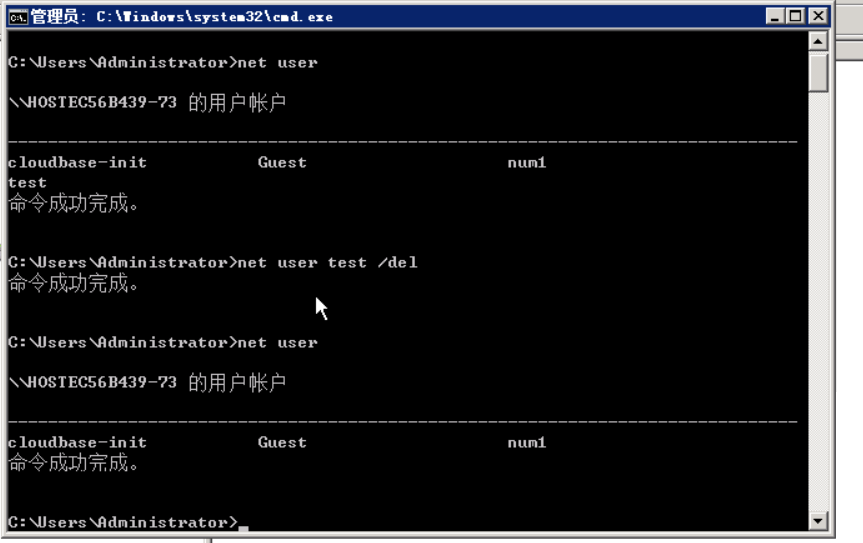 在cmd下使用“net user 用户名 /del”命令删除账号。