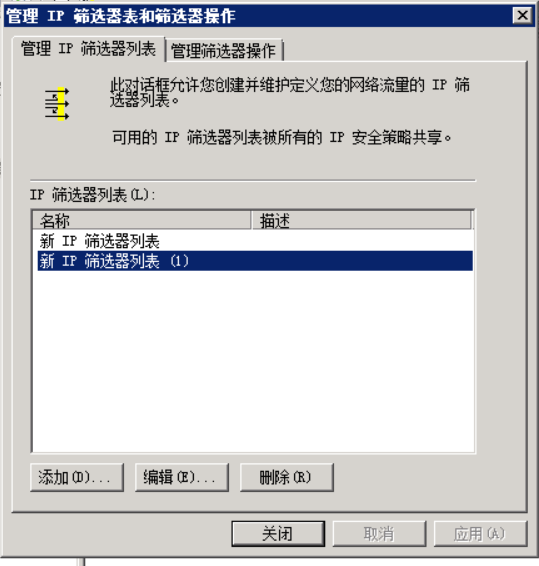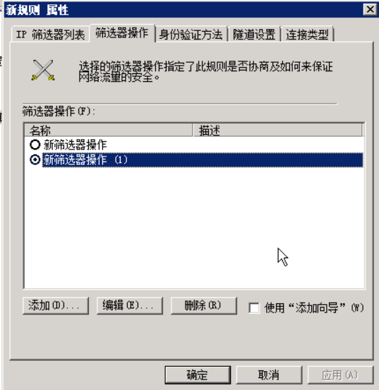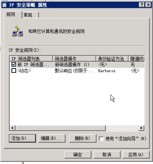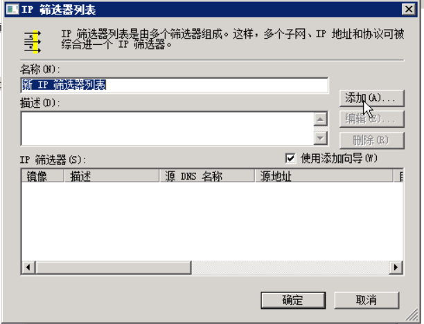 点击左边的添加来添加新的规则,在弹出的新规则属性里点击添加,弹出IP筛选器列表窗口,先把使用添加向导的复选框去掉