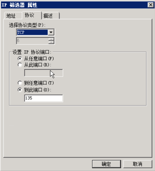 点击确定,这样就添加了一个屏蔽TCP135 端口的筛选器,可以防止别人通过135端口连接服务器,重复上面的步骤,把需要屏蔽的端口都建立相应的筛选器,协议类型要选择对应的类型。