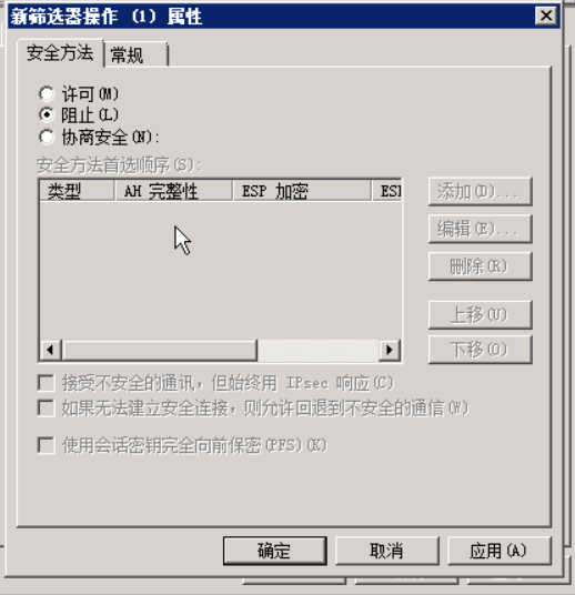 点击筛选器操作选项,去掉使用添加向导复选框,点击添加按钮,在新筛选器操作属性的安全方法中,选择阻止,点击应用,确定。