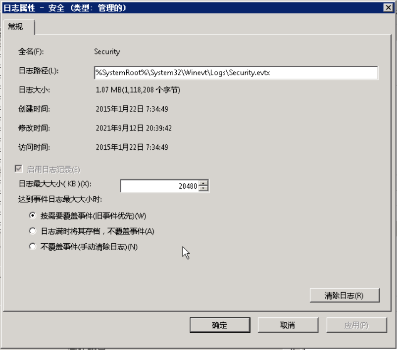 通过查看日志,能够发现登录异常等情况来判断自己有没有被入侵或攻击。系统默认的日志量较小,应该增大日志量大小,避免由于日志文件容量过小导致日志记录不全。右击要设置的日志类型,选择属性。