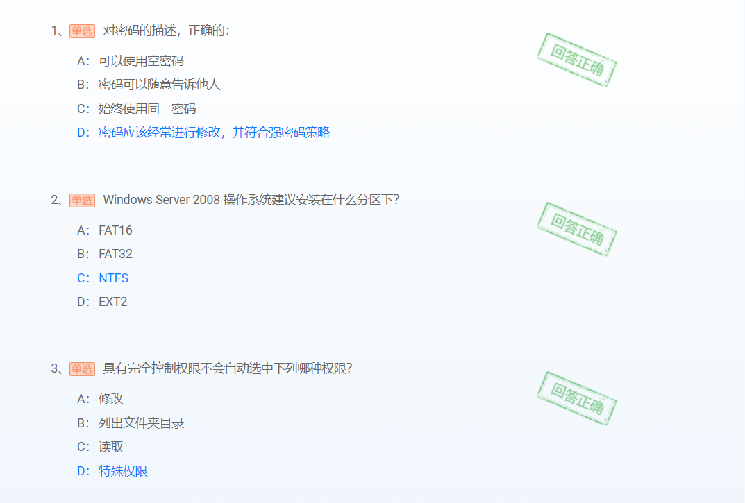 Windows server 2008 操作系统对NTFS 卷及其包含的目录或者文件提供了权限设置,分别是完全控制、修改、读取和运行、列出文件夹目录、读取、写入和特殊权限7个权限。