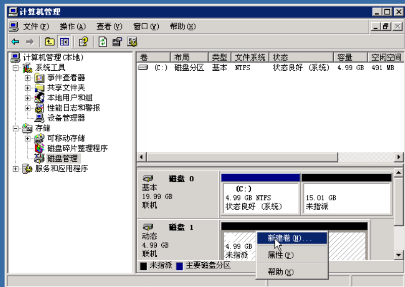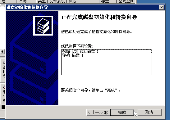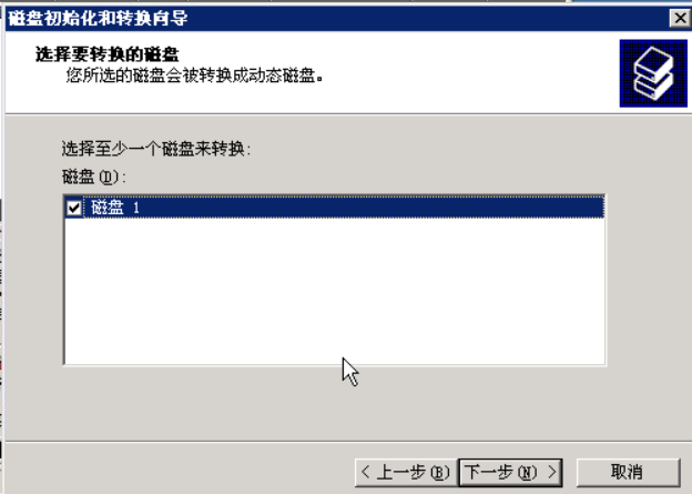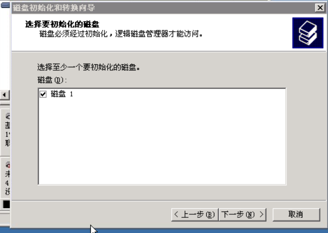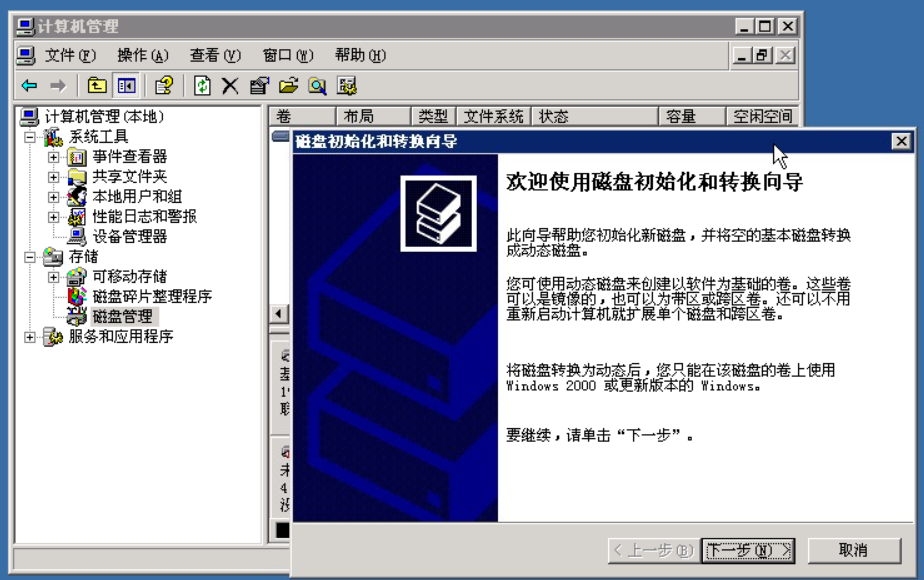 点击磁盘管理,会出现磁盘初始化和转换向导,利用向导添加一块新的磁盘,如下图: