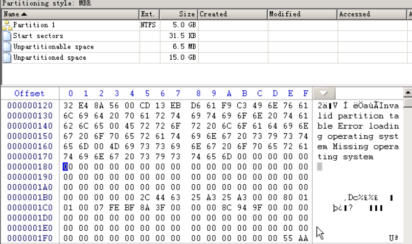 找到第一扇区末尾:000001F0处,查看末尾标志是否为55AA。