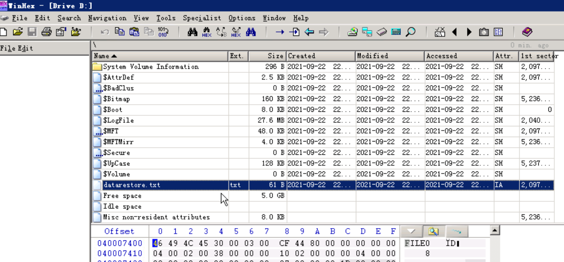 可以看到winhex自动查找硬盘文件系统,查找后找到被删除文件,被删除文件与存在的文件颜色不同: