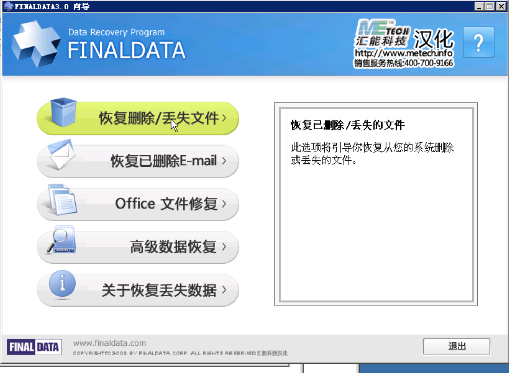 打开该程序,显示主界面如下图,选择“恢复删除/丢失文件”:
