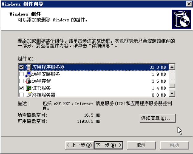 依次点击:“添加删除windows组件”,在组件向导中选中“应用程序服务器”与“证书服务”,先不要点击下一步: