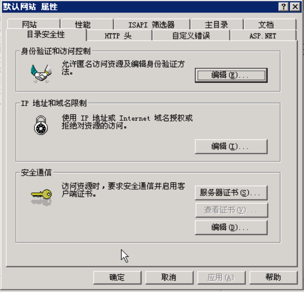 打开默认网站属性,选择“目录安全性”标签,单击“编辑”