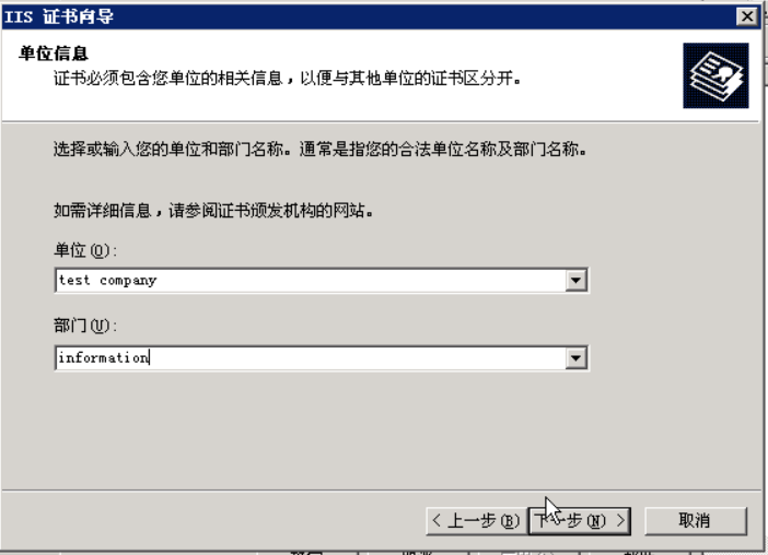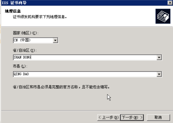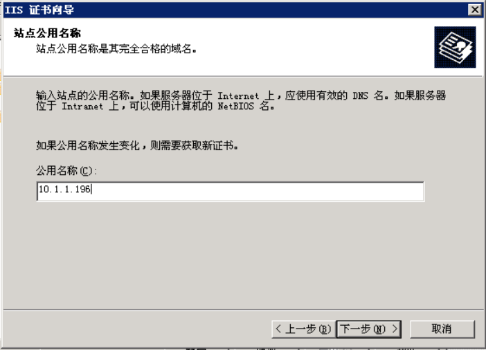填写公用名称,由于在本环境中没有使用DNS服务器,没有域名因此使用IP地址访问,在公用名称中输入本机的IP地址,如果名称错误,后面过程中会出现问题,因此应仔细核对: