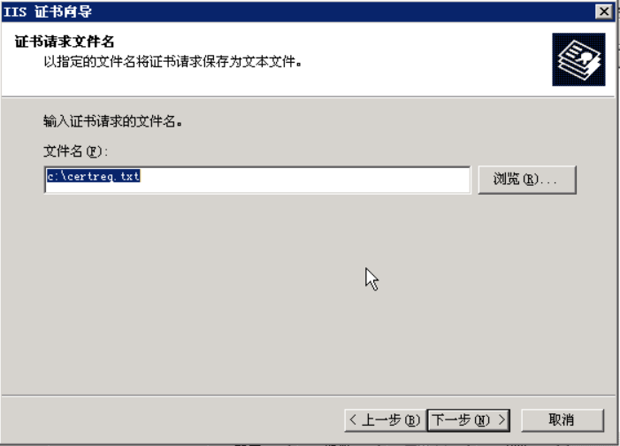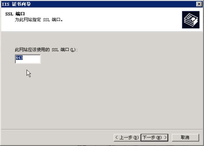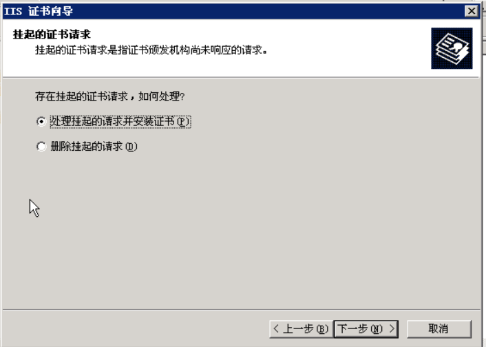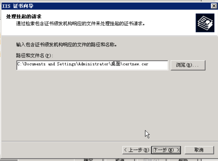 在“处理挂起请求”中选择“浏览”,选择刚才下载的证书文件,并打开,下一步,使用默认的443端口,点击下一步: