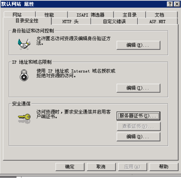 在“默认网站属性”中选择“目录安全性”标签,点击“服务器证书”: