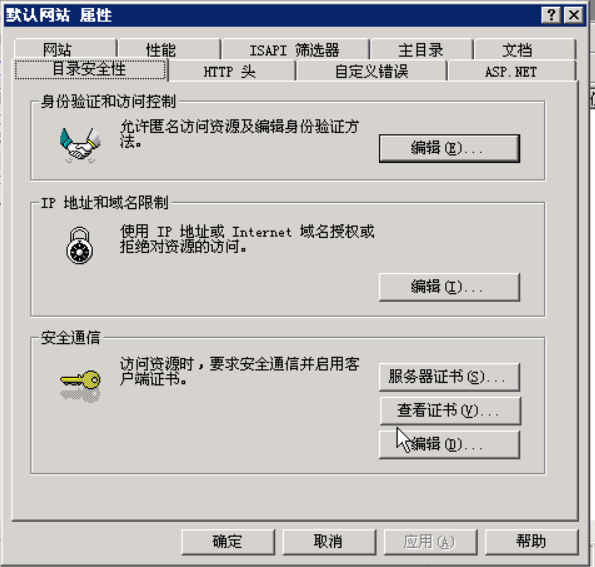 再进入到默认网站属性,选择“目录安全性”,单击“服务器证书”: