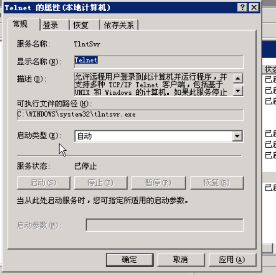 找到Telnet服务,然后更改启动类型为自动,并且启动Telnet服务