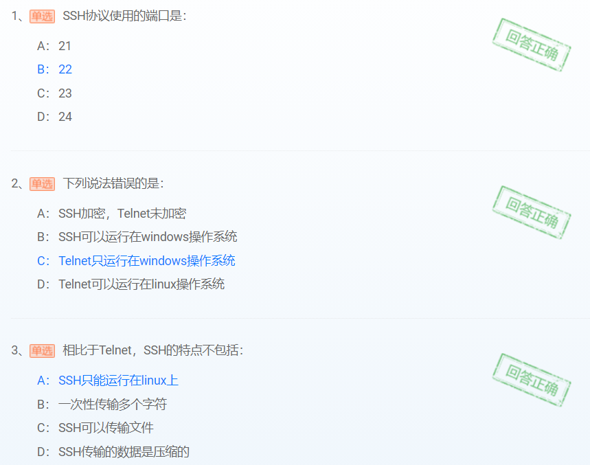 2.telnet的默认端口号为23;ssh的默认端口号为22.