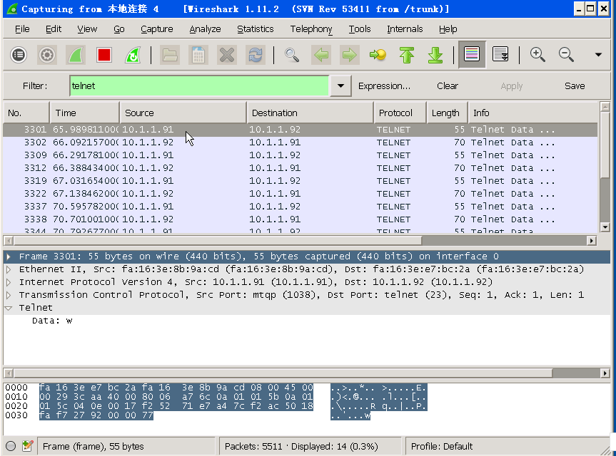 重新连接Telnet,然后在Wireshark中找到包