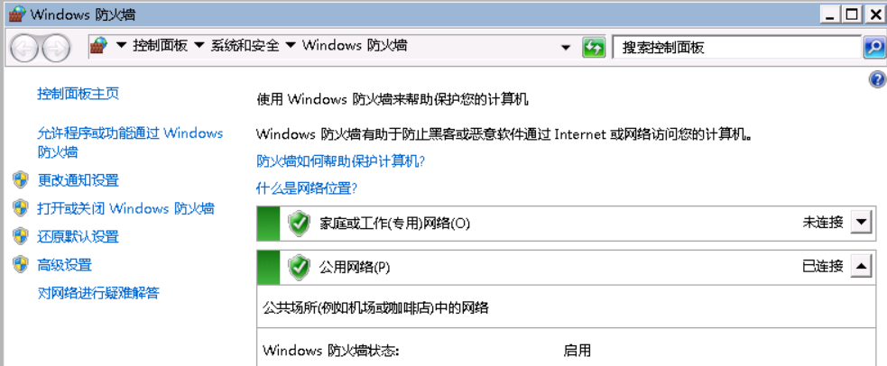 通过点击:开始-->控制面板-->系统和安全-->Windows 防火墙,出现“Windows防火墙”页面: