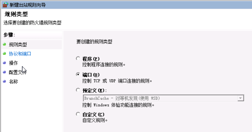 2)首先是“规则类型”配置,选择“端口”,并点击“下一步”。如下图: