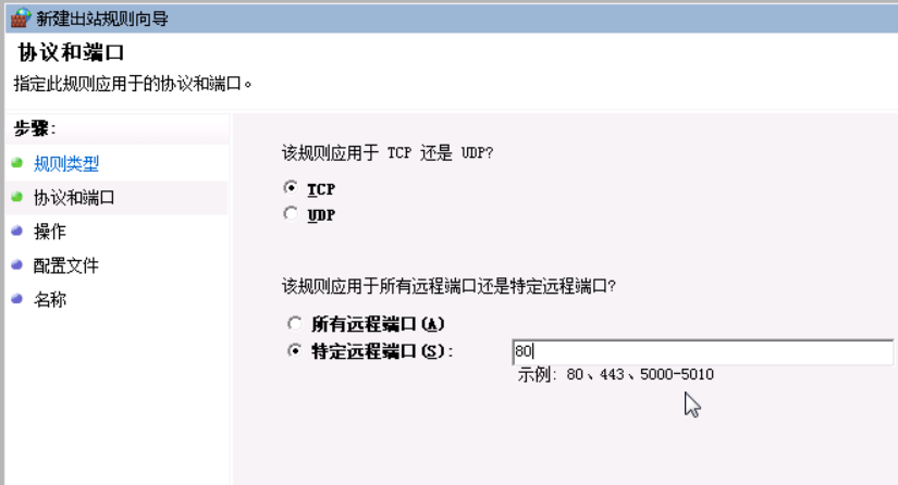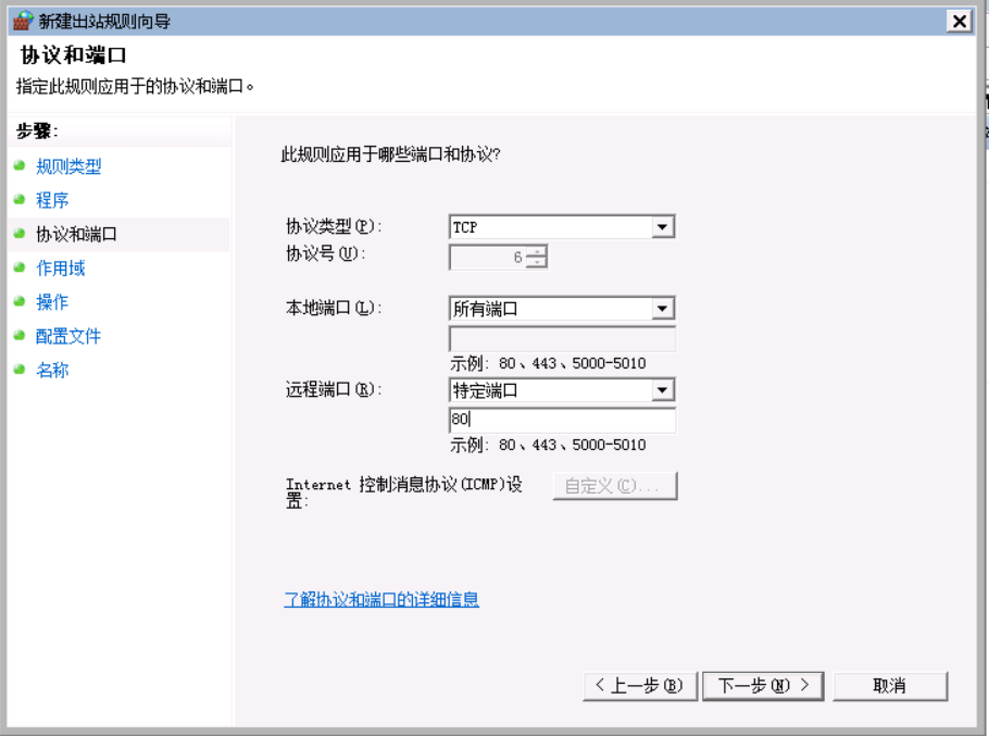 3)在“协议和端口”配置界面,选择“TCP”,选择“特定远程端口”,输入“80”,点“下一步”。见下图: