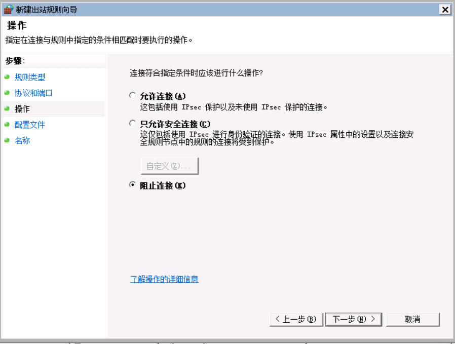 5)在“操作”界面,选择“阻止连接”,点“下一步”。