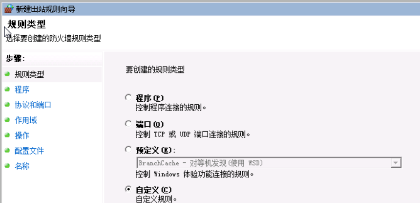 1)新建规则(出站规则),规则类型选“自定义”,点“下一步”。