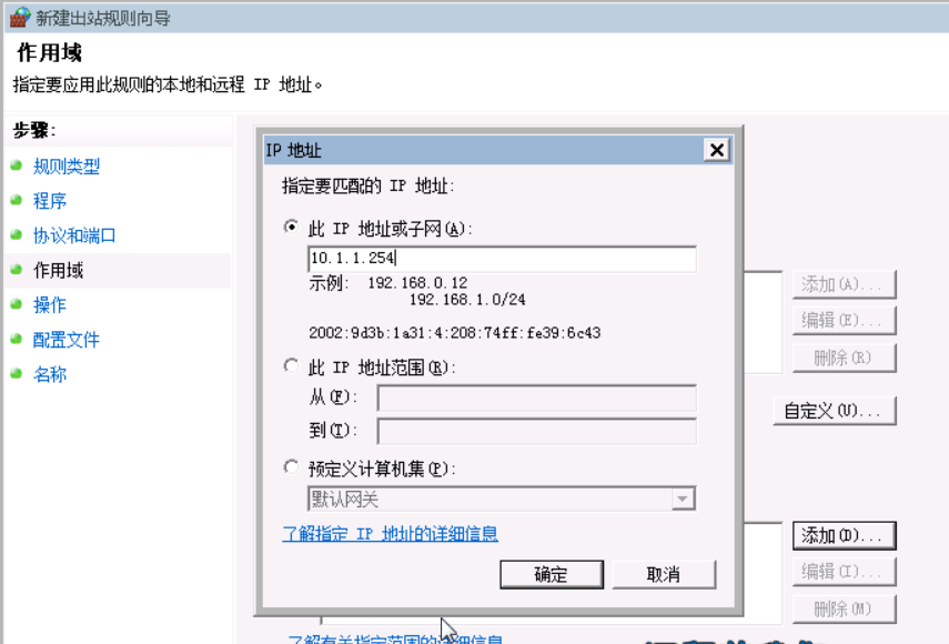 4)在“作用域”界面,点击“添加”,将弹出“IP地址”对话框,输入网址的IP地址,获取IP的方法为CMD 里ping tools.hetianlab.com,点击“确定”,回到“作用域”后,点击“下一步”。见下图: