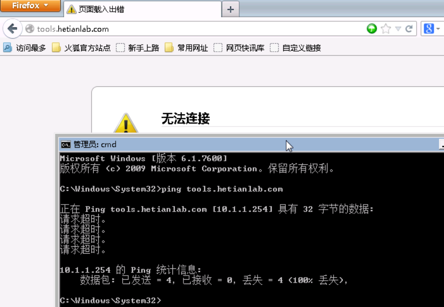 打开浏览器,此时已经无法访问http://tools.hetianlab.com。但可ping通。截图中返回了IP地址说明是通的,请求超时只是网站为了安全而设置的禁ping策略。