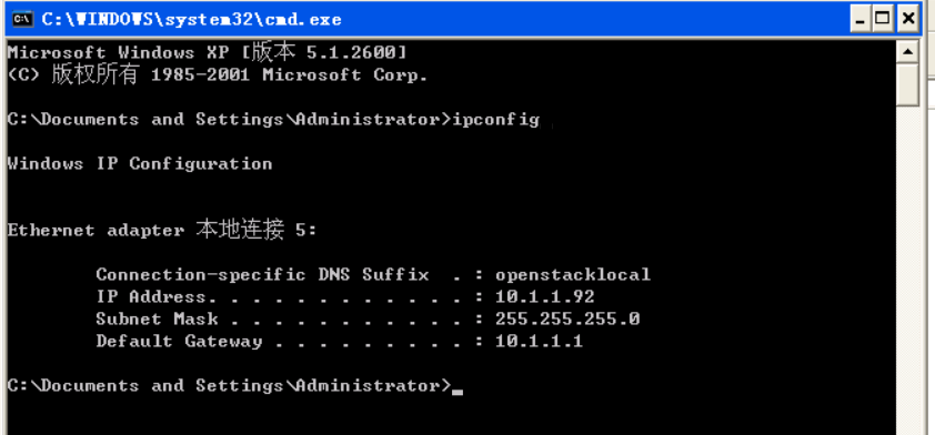 在“cmd”模式下输入“ipconfig”,如图5查询ip界面