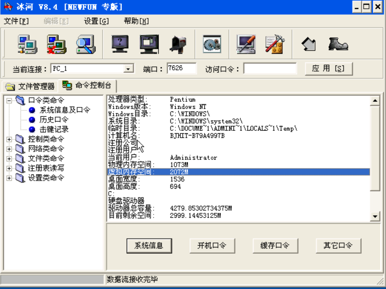 “系统信息及口令”:可以查看远程主机的系统信息,开机口令,缓存口令等。可看到非常详细的远程主机信息,这就无异于远程主机彻底暴露在攻击者面前